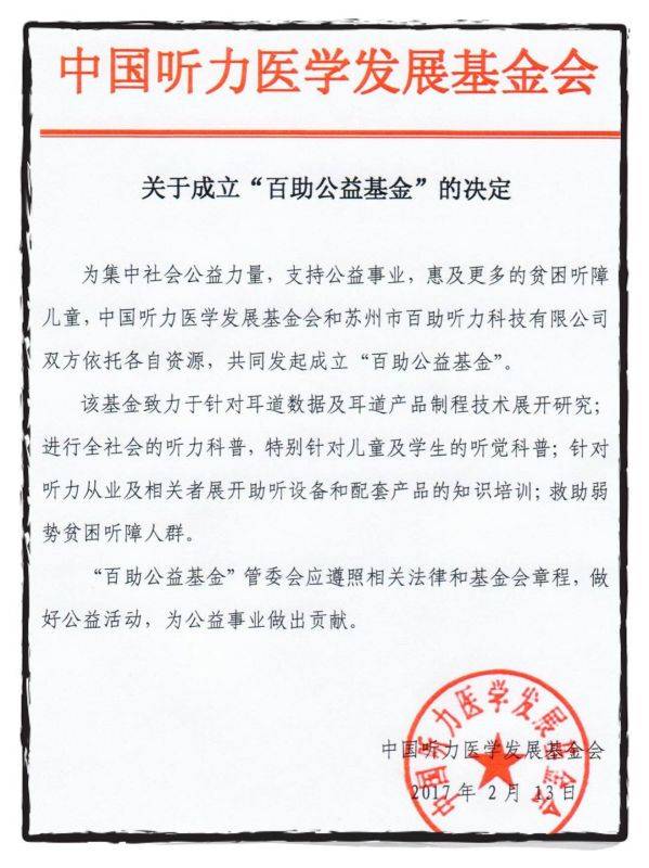 成立“中國聽力醫(yī)學(xué)發(fā)展基金會百助公益基金”(以下簡稱百助公益基金)。